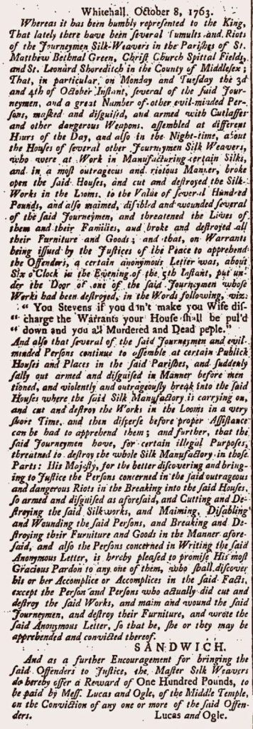 Another wave of unrest, in 1763, was due to smuggled goods and the cheaper importation of silks from France. Riots broke out in October 1763 and more followed throughout the 1760s. The Tubbs’s parish of St Matthew, Bethnal Green, was at the heart of things. The London Gazette of October 1763 reported the unrest.2