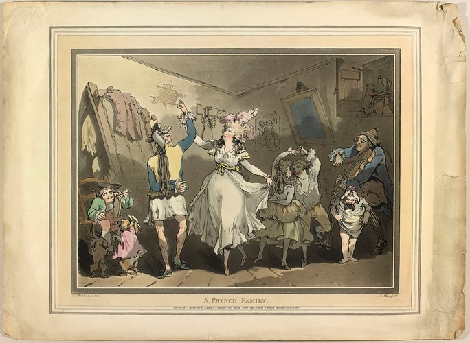 Thomas Rowlandson’s hand-coloured aquatint with etching of 1786 is at once poignant and humorous showing an impoverished French family aspiring to a former social, cultural and sartorial elegance, their surroundings now dilapidated, their Ancien Régime clothes now shabby.14